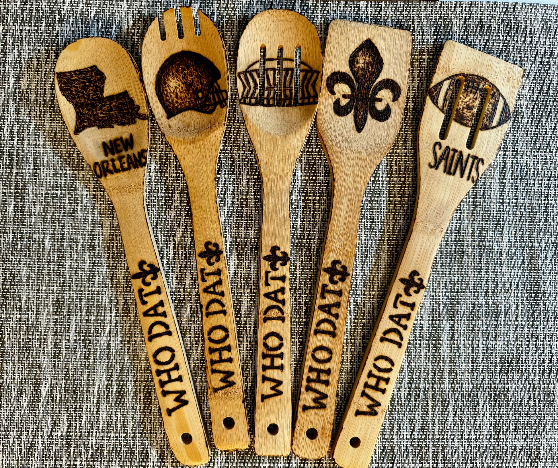 Presenting a unique, five-piece set of wood-burned 12” bamboo kitchen utensils each piece is hand-engraved with Saints Football-themed designs. To ensure durability, I treat the utensils with pure-tung oil, known for its food-safe and water-resistant properties. The hand-wood burning process may lead to minor variations in appearance, highlighting the uniqueness of each utensil. My commitment is to craft a beautiful product and provide an exceptional customer experience. I always welcome custom orders—please feel free to message me directly for assistance! ***Personalization Available*** Personalize the back of each utensil handle for an additional $12 by adding a name, word, or short phrase. Please enter the name or phrase you want engraved under the personalization option when ordering. If you require any assistance with your order, please contact me directly. ***Utensil Care*** To maintain your kitchen utensils, hand wash them with mild dish soap in warm water. Avoid soaking them or placing them in the dishwasher. When they appear dull, condition them with pure- tung oil or a similar food-safe oil. I always welcome custom orders and special requests please message me directly for assistance! Visit my shop to discover more unique home and garden decor and gifts!