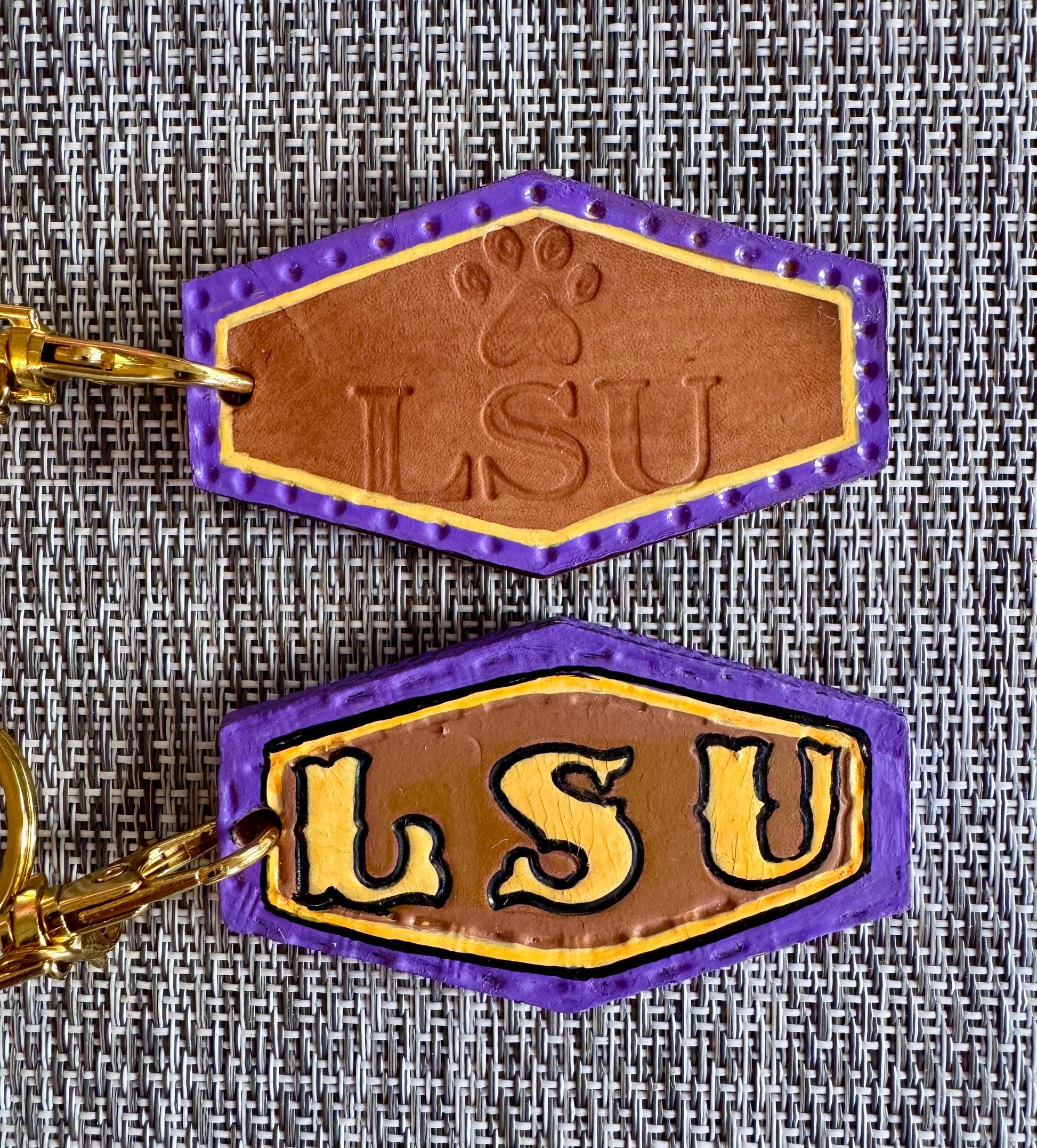 These are custom hand-tooled premium veg tan leather keychains. These beautiful keychains are completely handcrafted by myself so there may be slight differenes from photos. I hand stamp and carve the design of your choice then hand-paint with purple and yellow gold leather paint. The keychain is approximately 3”h x 2”w. There is a high-quality gold metal lobster clasp keyring. Please message me directly through Etsy messenger if you need any assistance or have any questions when placing your order! I always welcome custom orders! Be sure to check out my shop Redwoodleatherdesign.etsy.com to view all of my handcrafted wood and leather jewelry and home decor.
