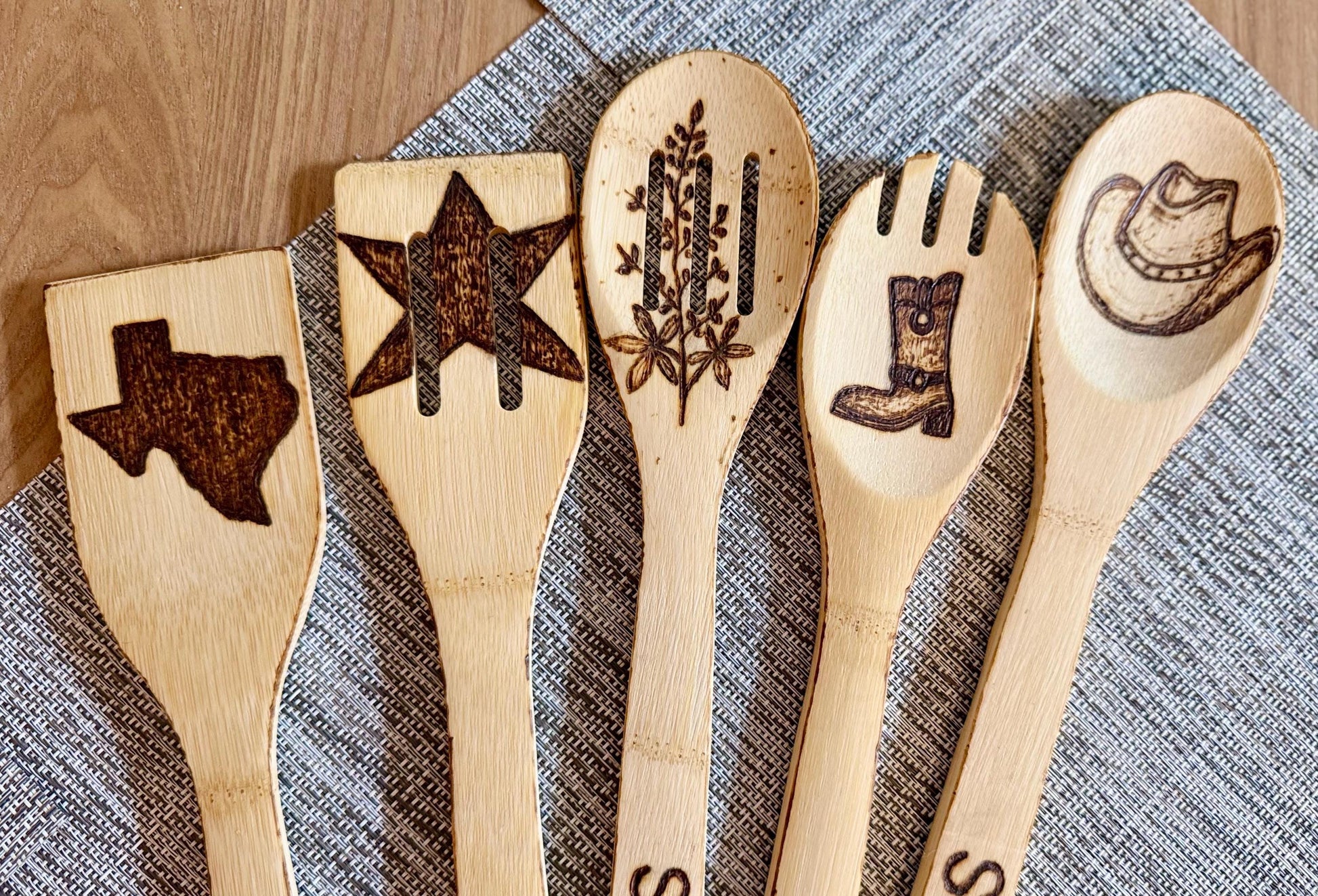 This is a one-of-a-kind wood burned bamboo kitchen utensil five-piece 12” set. I hand-wood burn each utensil with Texas-themed art. I use a food-safe, pure-tung oil to protect the utensils. Pure-tung oil is durable, food-safe, and water-resistant. I hand-wood burn each utensil which may result in slight differences in appearance. I always strive to create a beautiful piece and customer experience. I use Etsy messenger to communicate. I always welcome custom orders, please message me directly for assistance! ****Personalization Optional**** Add Personalization to the back of each utensil for an additional $12. I will engrave a name/word/short phrase. Please enter the desired name or short phrase to be engraved on the backside of utensils under personalization option when ordering. Please message me directly if you need any assistance placing an order! *** Utensil Care Instructions*** To care for your kitchen utensils please hand wash with a mild dish soap in warm water. Do not soak them in water or put them in a dishwasher. Use pure-tung oil or similar oil to condition your utensils when they become dull. I always welcome custom orders and special requests please message me directly for assistance! Visit my shop to discover more unique home and garden decor and gifts!