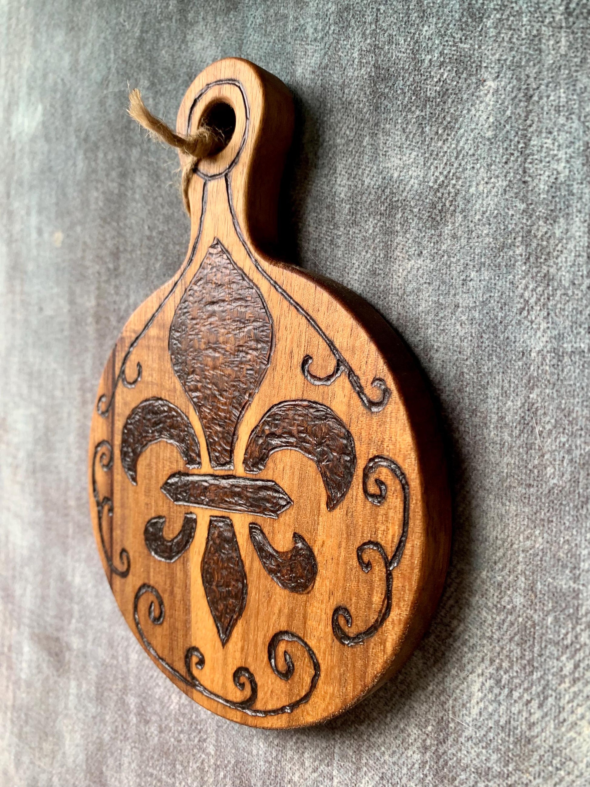 These Louisiana-inspired Acacia Wood mini-cutting boards are hand-wood burned. The board is circular with a handle that can be easily hung on a wall. It measures 4.5” w x 6.5” h x .5” depth. If you would like to place a custom order with a specific quote or design, please message me directly for assistance! These make awesome gifts, and I will add personalization to any item you purchase from my shop! I will accommodate most requests for additional sizes, shapes, and designs!
