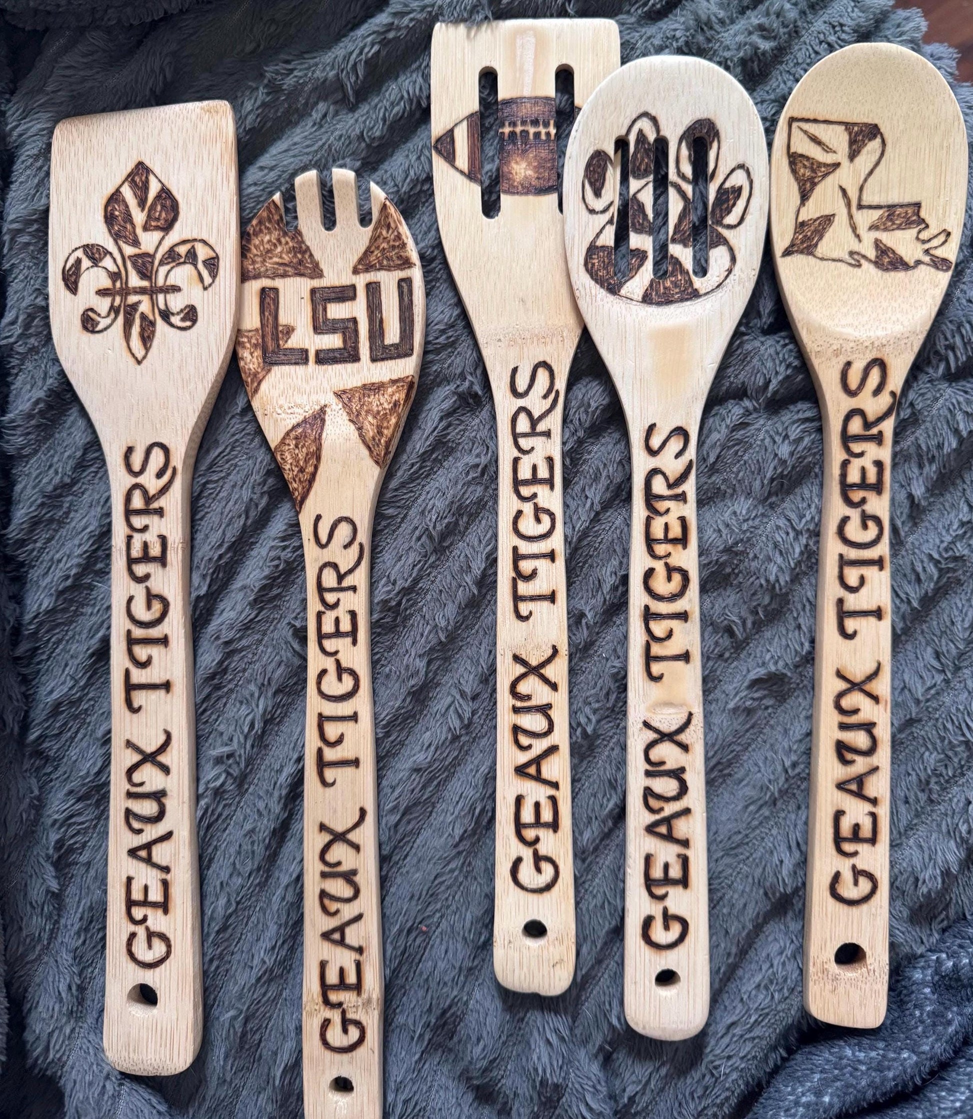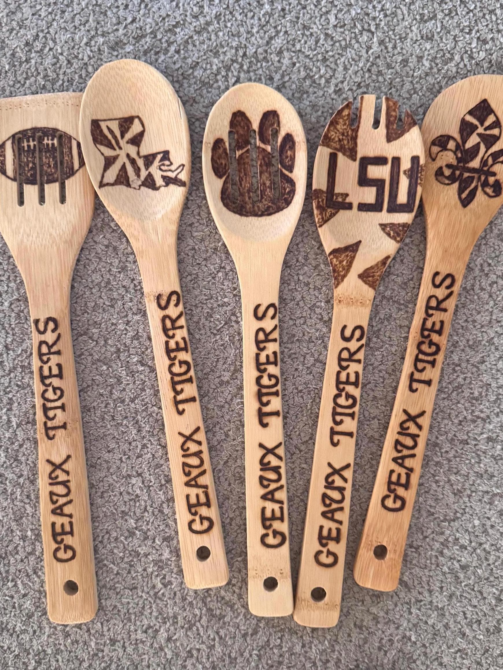 Geaux Tigers LSU wood-burned bamboo kitchen cooking utensil set, standard 12” five-pieces. Each utensil is hand-wood burned with an LSU-themed design and sealed with food-safe, pure-tung oil for durability and water resistance. As each piece is handcrafted, slight variations in appearance may occur, adding to the uniqueness of each item. My goal is to craft a beautiful product and provide an exceptional customer experience. Custom orders are always welcome: I am happy to modify wording/design to match your individual style!