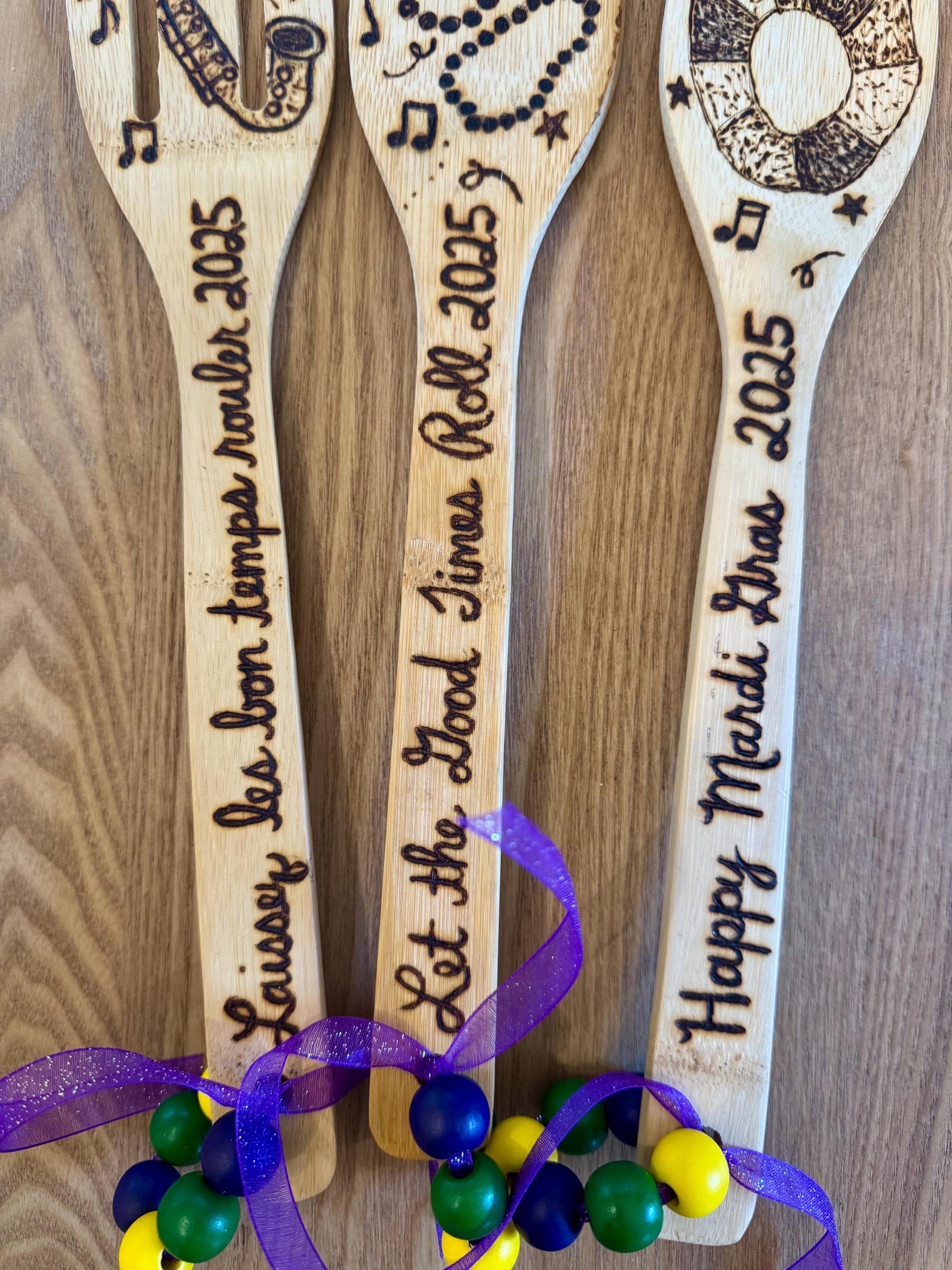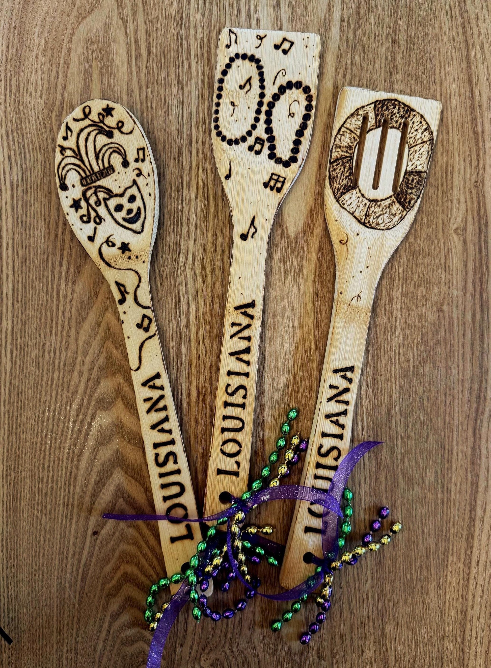 Mardi Gras Bamboo Utensil Set: Hand-Burned Louisiana Kitchen Decor