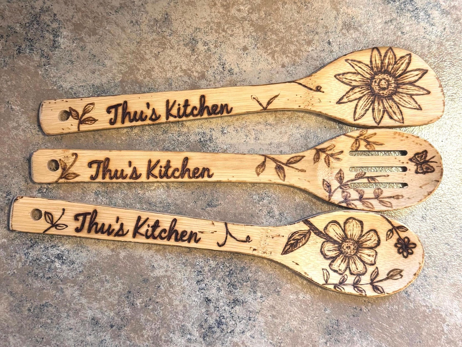 This custom 3-piece, eco-friendly, bamboo cooking utensil set is hand-wood burned with beautiful flowers and personalized especially for you! These utensils will last a lifetime and cost less than a dozen roses! This unique gift set is perfect for mom/grandmaw/friends/housewarming/Anniversaries and birthdays. Each utensil is hand-burned by me which may result in slight differences in appearance. I always strive to create a beautiful product and customer experience. If you need any assistance with your order, please send me a direct message! I use pure-tung oil to seal and protect each utensil. I will add personalization to each of the front of the handles of your set with your name/short phrase of choice Ex. (Lauren’s Kitchen). Simply enter the name/words you want added to the handle under the personalization option at checkout. I always welcome custom orders so if you’d like something specific, please message me directly for assistance! Visit my shop to discover more unique home and garden decor and gifts! ****To care for utensils**** Do not put in dishwasher. Hand wash only with warm water and dish soap and allow them to air dry. Do not leave them submerged in water. I recommend coating the utensils with pure-tung oil to protect the wood from moisture and damage every couple of months.